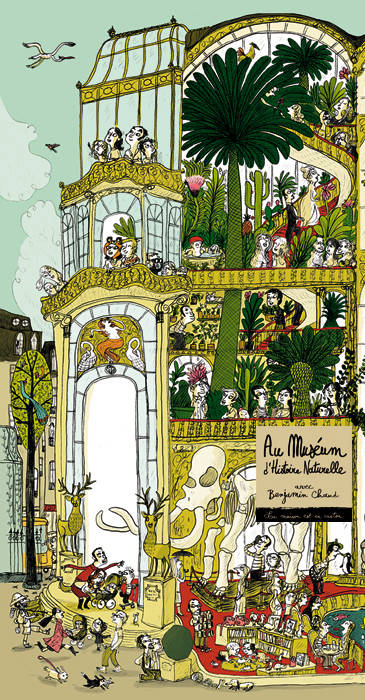 Probablement qu’un jour ne suffira pas pour visiter/explorer l’ensemble du Muséum d’histoire naturelle de Benjamin Chaud. Après l’entrée, vous découvrirez les poissons, les mammifères marins et sous-marins, sans oublier les squelettes de baleine, mammouth ou diplodocus. Vous apercevrez ensuite les félins, loups, pingouins, tortues, lémuriens, singes… Et au cœur du musée, la collection d’animaux empaillés de la Grande galerie de l’évolution, fascinant troupeau, avec en tête les éléphants, antilopes, chameaux, rhinocéros, buffles… À un autre niveau, trônent les immenses vitrines d’entomologie (insectes, papillons, lézards, serpents…), des oiseaux plus colorés les uns que les autres, les plantes exotiques, les animaux rares, les espèces en voie de disparition. Et dans une pièce protégée de la lumière, vous pourrez découvrir certaines espèces disparues telles que le dodo, un tigre blanc... Dans ce musée ou à proximité, vous croiserez probablement un explorateur qui vient apporter une découverte aux chercheurs du muséum, des taxidermistes, des botanistes, des scientifiques, des passionnés de nature… Et aussi peut-être, le mathématicien, biologiste et cosmologiste du siècle des Lumières, Georges-Louis Leclerc, comte de Buffon, en train de dessiner un oiseau, le naturaliste Charles Darwin et son singe, le Commandant Cousteau, l’héroïne Adèle Blanc-Sec et son créateur Jacques Tardi. Benjamin Chaud a glissé dans cette Grandimage d’autres personnages imaginaires : les héros de ses livres mais aussi Mowgli et Bagheera, Tarzan et Jane, le Yéti, une licorne, Cupidon, Fantômette, le calamar géant de 20 000 lieues sous les mers, Jonathan Livingston le goéland… Et même un ptérodactyle qui tente de s’échapper. Bonne visite !