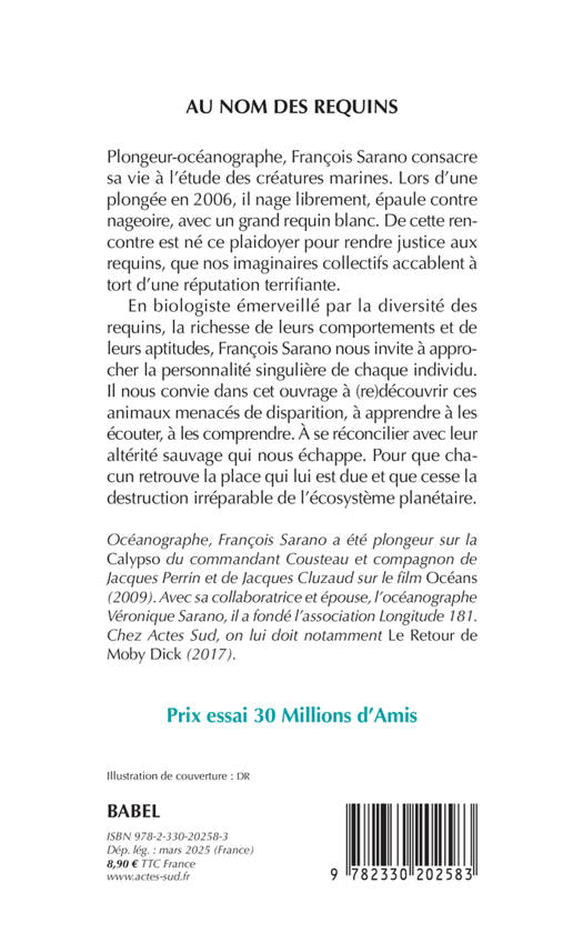 Plongeur-océanographe, François Sarano consacre sa vie à l'étude des créatures marines. Lors d'une plongée en 2006, il nage librement, épaule contre nageoire, avec un grand requin blanc. De cette rencontre est né ce plaidoyer pour rendre justice aux requins, que nos imaginaires collectifs accablent à tort d'une réputation terrifiante. En biologiste émerveillé par la diversité des requins, la richesse de leurs comportements et de leurs aptitudes, François Sarano nous invite à approcher la personnalité singulière de chaque individu. Il nous convie dans cet ouvrage à (re)découvrir ces animaux menacés de disparition, à apprendre à les écouter, à les comprendre. À se réconcilier avec leur altérité sauvage qui nous échappe. Pour que chacun retrouve la place qui lui est due et que cesse la destruction irréparable de l'écosystème planétaire.