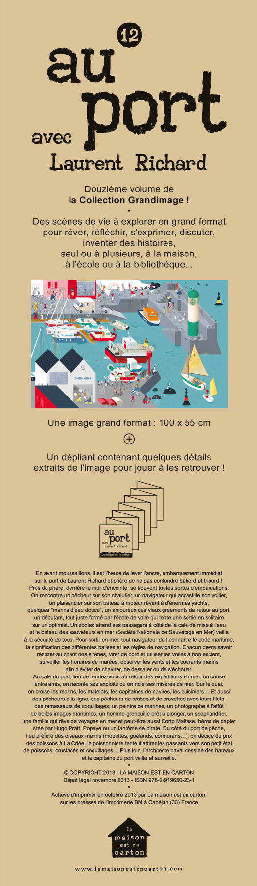 Une image grand format, tel un paravent, 100 x 55 cm, imprimée sur un papier d’art, qui se plie en 3 parties comme un accordéon + un dépliant (8 x 96 cm) contenant quelques détails extraits commentés de l’image pour jouer à les retrouver !
