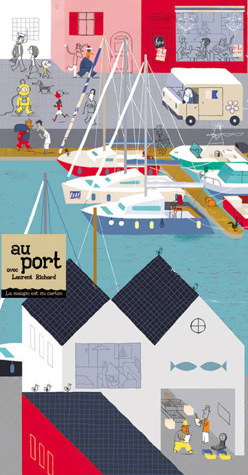 En avant moussaillons, il est l’heure de lever l’ancre, embarquement immédiat sur le port de Laurent Richard et prière de ne pas confondre bâbord et tribord ! Près du phare, derrière le mur d’enceinte, se trouvent toutes sortes d’embarcations. On rencontre un pêcheur sur son chalutier, un plaisancier qui accastille son voilier, un navigateur sur son bateau à moteur ou son yacht, espérons que ce ne soit pas un « marin d’eau douce », un amoureux des vieux gréements de retour au port, un débutant, tout juste formé par l’école de voile, tente une sortie en solitaire sur un optimist, un zodiac attend ses passagers à côté de la cale de mise à l’eau et le bateau des sauveteurs en mer (Société Nationale de Sauvetage en Mer) veille à la sécurité de tous. Pour sortir en mer, tout navigateur doit connaître le code maritime, la signification des différentes balises et les règles de navigation. Chacun devra ne pas se laisser entraîner par le chant des sirènes, savoir virer de bord et utiliser les voiles, observer les vents et les courants marins afin d’éviter de chavirer, de dessaler ou de s’échouer. Au café du port, lieu de rendez-vous au retour des expéditions en mer, on cause entre amis, on raconte ses exploits ou on noie ses misères de mer. Sur le quai, on croise les marins, les matelots, les capitaines de navires, les cuisiniers… mais aussi des pêcheurs à la ligne, des pêcheurs de crabes et de crevettes avec leur filet, les ramasseurs de coquillages, un peintre de marines, un photographes à l’affût de belles images maritimes, un homme-grenouille prêt à plonger, un scaphandrier, une famille qui rêve de voyages en mer et peut-être aussi Corto Maltesse, héros de papier créé par Hugo Pratt, Popeye ou un fantôme de pirate. Du côté du port de pêche, lieu préféré des oiseaux marins (mouettes, goélands, cormorans…), on décide du prix des poissons à La Criée, la poissonnière tente d’attirer les passants vers son petit étal de poissons, crustacés et coquillages… Plus loin, l'architecte naval dessine des bateaux et le capitaine du port veille et surveille.