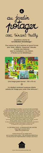 Vincent Mathy nous invite à une séance de jardinage. Dans cette Grandimage, nous aurons l’occasion de découvrir différents modes de culture (en terre, sous cloche, en serre…), les outils (fourche, pelle, râteau, binette, bêche, arrosoir, semoir, plantoir, sécateur, rouleau, brouette, tuyau d’arrosage, échelle…) et accessoires (tablier, bottes, treilles, tuteurs, pots, jardinières, godets, paillage, tonneau récupérateur d’eau, mangeoire et nichoir à oiseaux…), des fruits et légumes (choux, haricots grimpants, petits pois, poireaux, artichauts, tomates, carottes, navets, radis, melons, prunes, mûres, cassis…), graines, semences, plants, boutures, arbustes, plantes grimpantes ou rampantes, arbres fruitiers… Sans oublier l’épouvantail, le compost et tous les animaux que l’on peut croiser au jardin (escargot, papillon, oiseaux, insectes, coccinelle, hérisson, abeilles, verres de terre, taupe, écureuil, lapin…). Du labour à la confection des conserves, en passant par les semis, les plantations, le repiquage, l’arrosage, le désherbage, la cueillette, la récolte… le vocabulaire et l’univers du jardin est presque infini.