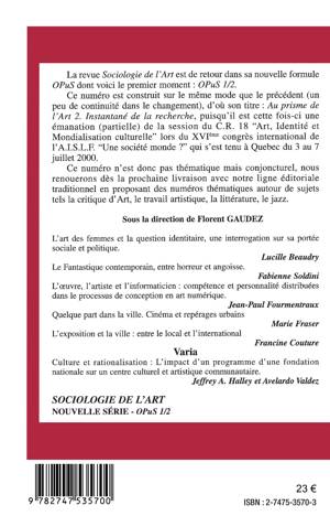 La revue Sociologie de l'art est de retour dans sa nouvelle formule OPuS dont voici le premier moment : OPuS 1/2. Ce numéro est construit sur le même mode que le précédent (un peu de continuité dans le changement), d'où son titre : Au prisme de l'art 2. Instantané de recherche, puisqu'il est cette fois-ci une émanation (partielle) de la session du CR 18 "Art, identité et mondialisation culturelle" lors du XVIème congrès international de l'AISLF "Une société monde ?", qui s'est tenu à Québec du 3 au 7 juillet 2000. Ce numéro n'est donc pas thématique mais conjoncturel, nous renouerons dès la prochaine livraison avec notre ligne éditoriale traditionnelle en proposant des numéros thématiques autour de sujets tels que la critique d'art, le travail artistique, la littérature, le jazz.