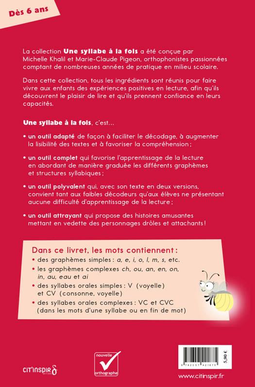 Des textes adaptés pour lire plus facilement ! Pour faciliter l’apprentissage de la lecture, les mots qui composent les histoires ont été sélectionnés en fonction de leur familiarité, de leur structure syllabique et des graphèmes* qu’ils contiennent. Plusieurs adaptations visuelles permettent de réduire la charge cognitive liée au décodage et de limiter l’encombrement perceptif. Les livrets contiennent deux fois la même histoire : dans la première version, syllabes orales, lettres muettes et graphèmes complexes sont mis en relief ; dans la seconde, ces adaptations ne sont pas présentes. Ce sont donc des outils polyvalents qui favorisent le transfert des acquis et qui conviennent à tous les enfants. Les histoires fantaisistes mettent en scène des personnages rigolos et attachants. La trame narrative captive les jeunes lecteurs tout en leur permettant de faire des prédictions. Les illustrations leur donnent aussi de nombreuses occasions de faire des inférences.