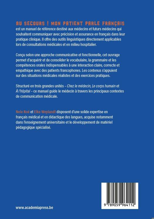 Au secours ! Mon patient parle français est un manuel de référence destiné aux médecins et futurs médecins qui souhaitent communiquer avec précision et assurance en français dans leur pratique clinique. Il offre des outils linguistiques directement applicables lors de consultations médicales et en milieu hospitalier.