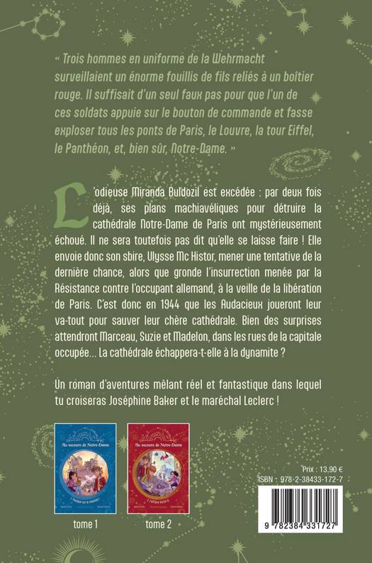 L’odieuse Miranda Buldozil est excédée : par deux fois déjà, ses plans machiavéliques pour détruire la cathédrale Notre-Dame de Paris ont mystérieusement échoué. Il ne sera toutefois pas dit qu’elle se laisse faire ! Elle envoie donc son sbire, Ulysse Mc Histor, mener une tentative de la dernière chance, alors que gronde l’insurrection menée par la Résistance contre l’occupant allemand, à la veille de la libération de Paris. C’est donc en 1944 que les Audacieux joueront leur va-tout pour sauver leur chère cathédrale. Bien des surprises attendront Marceau, Suzie et Madelon, dans les rues de la capitale occupée… La cathédrale échappera-t-elle à la dynamite ? Un roman d’aventures mêlant réel et fantastique dans lequel tu croiseras Joséphine Baker et le maréchal Leclerc !