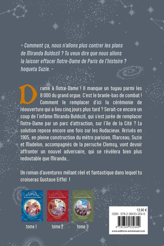 Drame à Notre-Dame ! Il manque un tuyau parmi les 8 000 du grand orgue. C’est le branle-bas de combat ! Comment le remplacer d’ici la cérémonie de réouverture qui a lieu cinq jours plus tard ? Serait-ce encore un coup de l’infâme Miranda Buldozil, qui s’est jurée de remplacer Notre-Dame par un parc d’attraction, sur l’île de la Cité ? La solution repose encore une fois sur les Audacieux. Arrivés en 1905, en pleine construction du métro parisien, Marceau, Suzie et Madelon, accompagnés de la perruche Clemsy, vont devoir affronter un nouvel adversaire, qui se révèlera bien plus redoutable que Miranda… Un roman d’aventures mêlant réel et fantastique dans lequel tu croiseras Gustave Eiffel !