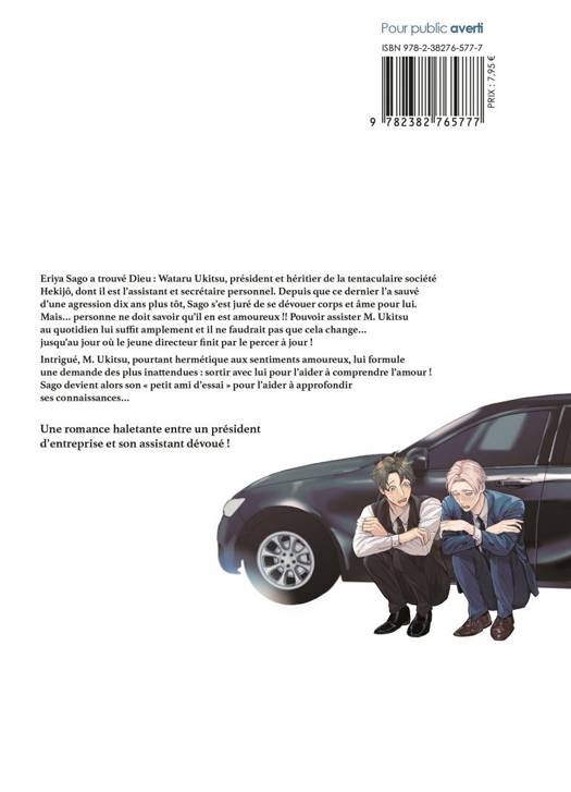 Eriya Sago a trouvé Dieu : Wataru Ukitsu, président et héritier de la tentaculaire société Hekijô, dont il est l'assistant et secrétaire personnel. Depuis que ce dernier l'a sauvé d'une agression dix ans plus tôt, Sago s'est juré de se dévouer corps et âme pour lui. Mais... personne ne doit savoir qu'il en est amoureux !! Pouvoir assister M. Ukitsu au quotidien lui suffit amplement et il ne faudrait pas que cela change... jusqu'au jour où le jeune directeur finit par le percer à jour ! Intrigué, M. Ukitsu, pourtant hermétique aux sentiments amoureux, lui formule une demande des plus inattendues : sortir avec lui pour l'aider à comprendre l'amour ! Sago devient alors son " petit ami d'essai " pour l'aider à approfondir ses connaissances...