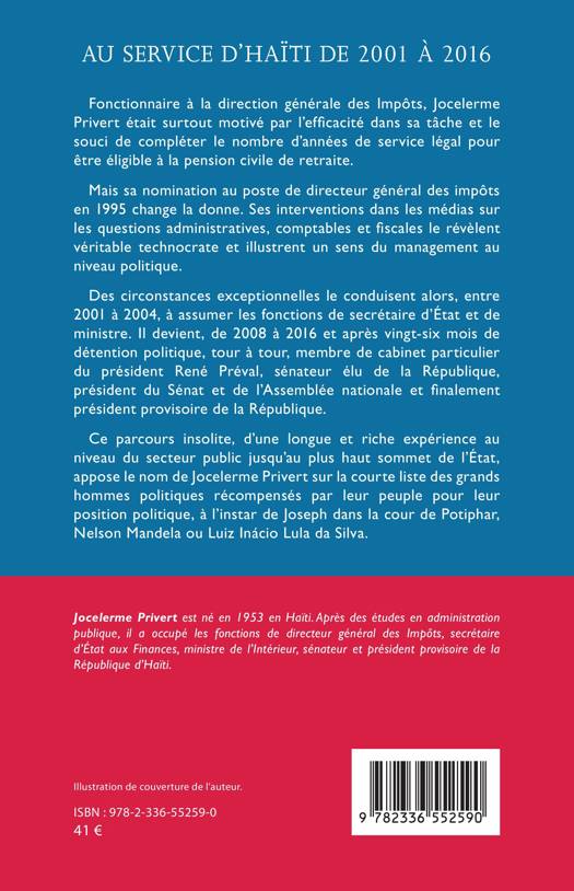 Fonctionnaire à la direction générale des Impôts, Jocelerme Privert était surtout motivé par l'efficacité dans sa tâche et le souci de compléter le nombre d'années de service légal pour être éligible à la pension civile de retraite. Mais sa nomination au poste de directeur général des impôts en 1995 change la donne. Ses interventions dans les médias sur les questions administratives, comptables et fiscales le révèlent véritable technocrate et illustrent un sens du management au niveau politique. Des circonstances exceptionnelles le conduisent alors, entre 2001 à 2004, à assumer les fonctions de secrétaire d'État et de ministre. Il devient, de 2008 à 2016 et après vingt-six mois de détention politique, tour à tour, membre de cabinet particulier du président René Préval, sénateur élu de la République, président du Sénat et de l'Assemblée nationale et finalement président provisoire de la République. Ce parcours insolite, d'une longue et riche expérience au niveau du secteur public jusqu'au plus haut sommet de l'État, appose le nom de Jocelerme Privert sur la courte liste des grands hommes politiques récompensés par leur peuple pour leur position politique, à l'instar de Joseph dans la cour de Potiphar, Nelson Mandela ou Luiz Inácio Lula da Silva.