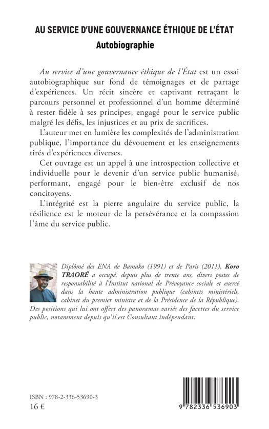 Au service d'une gouvernance éthique de l'État est un essai autobiographique sur fond de témoignages et de partage d'expériences. Un récit sincère et captivant retraçant le parcours personnel et professionnel d'un homme déterminé à rester fidèle à ses principes, engagé pour le service public malgré les défis, les injustices et au prix de sacrifices. L'auteur met en lumière les complexités de l'administration publique, l'importance du dévouement et les enseignements tirés d'expériences diverses. Cet ouvrage est un appel à une introspection collective et individuelle pour le devenir d'un service public humanisé, performant, engagé pour le bien-être exclusif de nos concitoyens. L'intégrité est la pierre angulaire du service public, la résilience est le moteur de la persévérance et la compassion l'âme du service public.