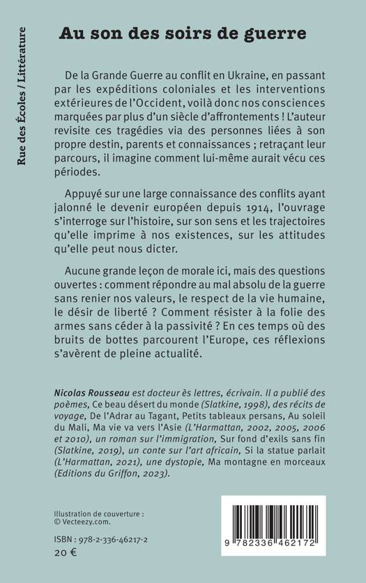 De la Grande Guerre au conflit en Ukraine, en passant par les expéditions coloniales et les interventions extérieures de l’Occident, voilà donc nos consciences marquées par plus d’un siècle d’affrontements ! L’auteur revisite ces tragédies via des personnes liées à son propre destin, parents et connaissances ; retraçant leur parcours, il imagine comment lui-même aurait vécu ces périodes. Appuyé sur une large connaissance des conflits ayant jalonné le devenir européen depuis 1914, l’ouvrage s’interroge sur l’histoire, sur son sens et les trajectoires qu’elle imprime à nos existences, sur les attitudes qu’elle peut nous dicter. Aucune grande leçon de morale ici, mais des questions ouvertes : comment répondre au mal absolu de la guerre sans renier nos valeurs, le respect de la vie humaine, le désir de liberté ? Comment résister à la folie des armes sans céder à la passivité ? En ces temps où des bruits de bottes parcourent l’Europe, ces réflexions s’avèrent de pleine actualité.