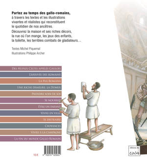Michel Piquemal, auteur incontournable de la littérature jeunesse française, signe ici un très beau livre documentaire sur la vie quotidienne à l'époque romaine. Grand amateur d'histoire, il entraîne le jeune lecteur à remonter le temps pour découvrir le monde gallo-romain : vêtements, nourriture, intérieur de maisons, distractions, manière de soigner, thermes, école ... Le superbes planches de Philippe Archer permettent au jeune lecteur de pénétrer dans la rue et la maison.