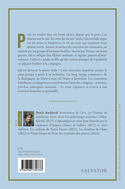 Paris est tombé dans un lourd silence depuis que la peste s'est abattue sur la cité. En cette fin du XIVe siècle, l'incertitude règne sur les jours et bouleverse la vie de ceux qui croyaient leurs destins tracés. Aurore, la recluse du cimetière des Innocents, est chassée par un groupe d'hommes hostiles. Sauvée par Tristan, un jeune paysan, elle se réfugie chez Éliézer, médecin, et Agathe, peintre d'enluminures. Celle-ci a perdu sa fille qu'elle croyait protéger de l'épidémie en plaçant l'enfant à la campagne. Qu'est devenue la petite Aube ? Cette rencontre imprévue pousse le petit groupe à partir à sa recherche. Un long voyage commence, de la Bourgogne au Mont-Cenis, de Venise à Jérusalem. Les rencontres bénéfiques ou dangereuses transforment l'âme des voyageurs : sorcières, porcher, aubergiste, marinier⦠Le cÅur s'éprouve et s'ouvre à une aventure humaine et spirituelle.