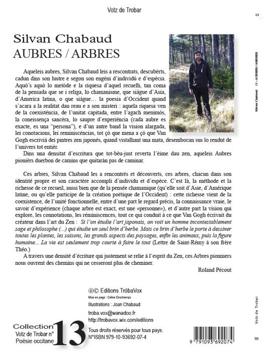 "Ces arbres, Silvan Chabaud les a rencontrés et découverts, ces arbres, chacun dans son identité propre et son caractère accompli d'individu et d'espèce. C'est là la méthode et la richesse de ce recueil, aussi bien que de la pensée chamanique (qu'elle soit d'Asie, d'Amérique latine, ou qu'elle participe de la création poétique de l'Occident) : cette richesse vient de la coexistence, de l'unité fonctionnelle, entre d'une part le regard précis, la connaissance vraie, le savoir d'expérience (chaque arbre est exact, est une "personne"), et d'autre part la vision qui explore, les connotations, les réminiscences, tout ce qui conduit à ce que Van Gogh écrivait du créateur dans l'art du Zen :Si l'on étudie l'art japonais, on voit un homme incontestablement sage et philosophe (...) qui étudie un seul brin d'herbe. Mais ce brin d'herbe le porte à dessiner toutes les plantes, les saisons, les grands aspects des paysages, enfin les animaux, puis la figure humaine... La vie est seulement trop courte à faire le tout (Lettre de Saint-Rémy à son frère Théo.)