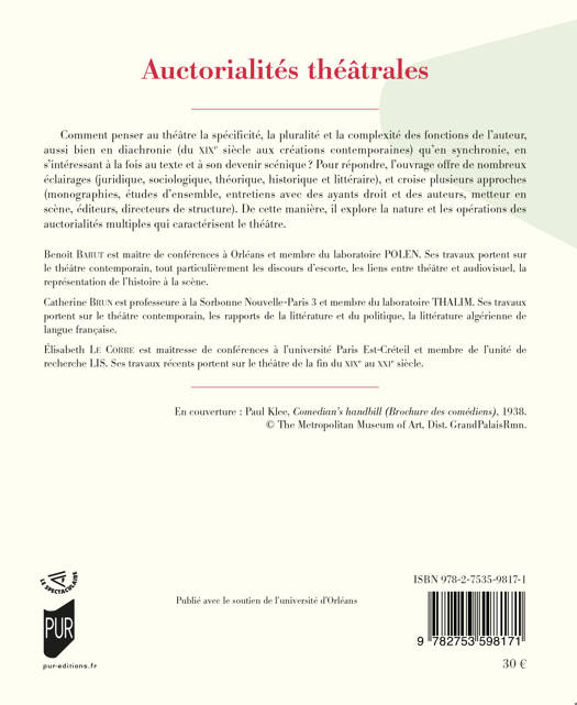 Comment penser au théâtre la spécificité, la pluralité et la complexité des fonctions de l’auteur, aussi bien en diachronie (du XIXe siècle aux créations contemporaines) qu’en synchronie, en s’intéressant à la fois au texte et à son devenir scénique ? Pour répondre, l’ouvrage offre de nombreux éclairages (juridique, sociologique, théorique, historique et littéraire), et croise plusieurs approches (monographies, études d’ensemble, entretiens avec des ayants droit et des auteurs, metteur en scène, éditeurs, directeurs de structure). De cette manière, il explore la nature et les opérations des auctorialités multiples qui caractérisent le théâtre.