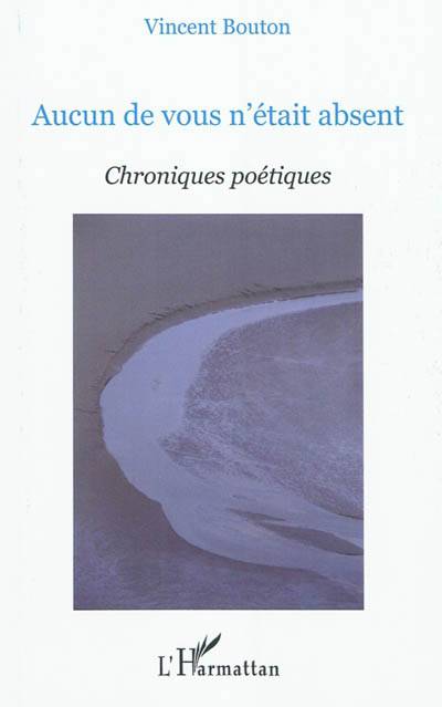 Dans ce nouveau recueil poétique, en forme de chroniques, Vincent Bouton fait appel : « Aimer sans preuve que l'amour existe et le faire ainsi exister ». L'auteur est en quête de présence, de sa propre présence. « Remercier son propre corps d'être ce qu'il est : langage au monde. » Mais aussi présence des hommes que la forêt dessine. « Revenir de la forêt. Les jambes lourdes et les joues rouges. » Présence de Dieu que la Lumière, le Souffle, le Nom entre-disent. « Que la lumière vous conduise vers sa transparence, absolue destinée. » Le titre de ce recueil en dit long. « Aucun de vous n'était absent. » C'est un appel au salut universel à travers le tamis de la vie. Eschatologie chrétienne ? Sans doute : « Alors, ils ont tous avancé vers la table. » Mais à un certain prix. En déjouant les pièges. « D'un arbre à l'autre, de haine en haine, de dieu en dieu comme autant de chaînes. » En dépassant l'épreuve : « Votre douleur est là, occupant vos sommeils ». En se donnant dans l'écriture, véritable maïeutique : « ... par ce fait il [le poète] tente son propre synchronisme vital, commun à l'espèce qu'il sur-dit, en désespoir d'ordonner son chaos propre à l'harmonie qu'il attend. »