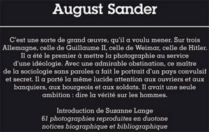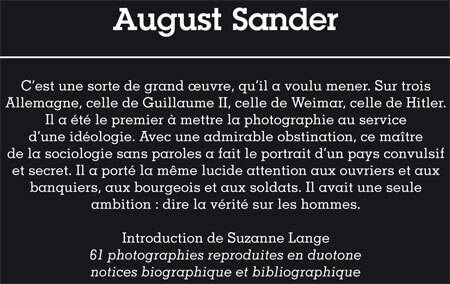 C'est une sorte de grand oeuvre, qu'il a voulu mener. Sur trois Allemagne, celle de Guillaume II, celle de Weimar, celle de Hitler. Il a été le premier à mettre la photographie au service d'une idéologie. Avec une admirable obstination, ce maître de la sociologie sans paroles a fait le portrait d'un pays convulsif et secret. Il a porté la même lucide attention aux ouvriers et aux banquiers, aux bourgeois et aux soldats. Il avait une seule ambition : dire la vérité sur les hommes.