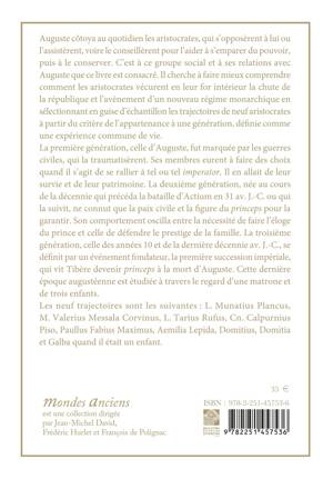 Auguste côtoya au quotidien les aristocrates, qui s’opposèrent à lui ou l’assistèrent, voire le conseillèrent pour l’aider à s’emparer du pouvoir, puis à le conserver. C’est à ce groupe social et à ses relations avec Auguste que ce livre est consacré. Il cherche à faire mieux comprendre comment les aristocrates vécurent en leur for intérieur la chute de la république et l’avènement d’un nouveau régime monarchique en sélectionnant en guise d’échantillon les trajectoires de neuf aristocrates à partir du critère de l’appartenance à une génération, définie comme une expérience commune de vie.