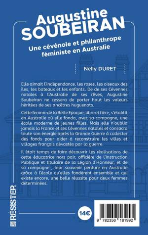 Elle aimait l'indépendance, les roses, les oiseaux des îles, les bateaux et les enfants. De ses Cévennes natales à l'Australie de ses rêves, Augustine Soubeiran ne cessera de porter haut les valeurs héritées de ses ancêtres huguenots. Cette femme de la Belle époque, libre et fière, s'établit en Australie où elle fonda, avec sa compagne, une école moderne de jeunes filles. Mais elle n'oublia jamais la France et ses Cévennes natales et consacra toute son énergie après la Grande Guerre à collecter des fonds pour aider à reconstruire les villes et villages français dévastés par la guerre. Il était temps de faire découvrir les réalisations de cette éducatrice hors pair, officière de l'Instruction Publique et titulaire de la Légion d'Honneur, et de sa compagne; leur souvenir perdure en Australie grâce à l'école qu'elles fondèrent ensemble et qui existe encore, une belle réussite pour deux femmes déterminées.