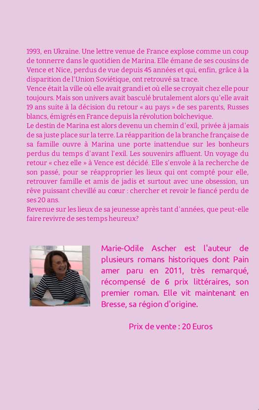1993, en Ukraine. Une lettre venue de France explose comme un coup de tonnerre dans le quotidien de Marina. Elle émane de ses cousins de Vence et Nice, perdus de vue depuis 45 années et qui, enfin, grâce à la disparition de l'Union Soviétique, ont retrouvé sa trace. Vence était la ville où elle avait grandi et où elle se croyait chez elle pour toujours. Mais son univers avait basculé brutalement alors qu'elle avait 19 ans suite à la décision du retour « au pays » de ses parents, Russes blancs, émigrés en France depuis la révolution bolchevique.