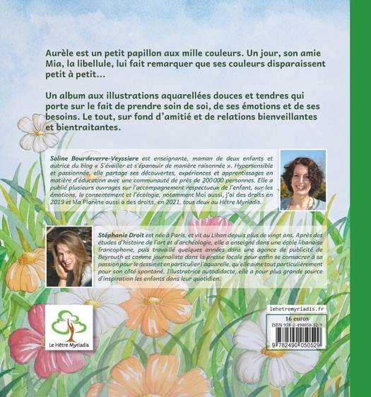 Aurèle est un petit papillon aux mille couleurs. Un jour, son amie Mia, la libellule, lui fait remarquer que ses couleurs disparaissent petit à petit. Ensemble, ils comprennent que pour les retrouver, Aurèle doit remplir son réservoir d'amour. Intérieurement, en prenant soin de lui. Et extérieurement, par ses relations bienveillantes avec les autres. Une histoire sur le réservoir affectif qui se vide et se remplit au gré des expériences. Apprenons à le remplir avec des choses qui nous viennent des autres ainsi qu'avec ce qui nous vient de l'intérieur de nous-mêmes. Un album aux illustrations aquarellées douces et tendres qui porte sur le réservoir affectif, le fait de prendre soin de soi, de ses émotions et de ses besoins. Le tout, sur fond d'amitié et de relations bienveillantes et bientraitantes.