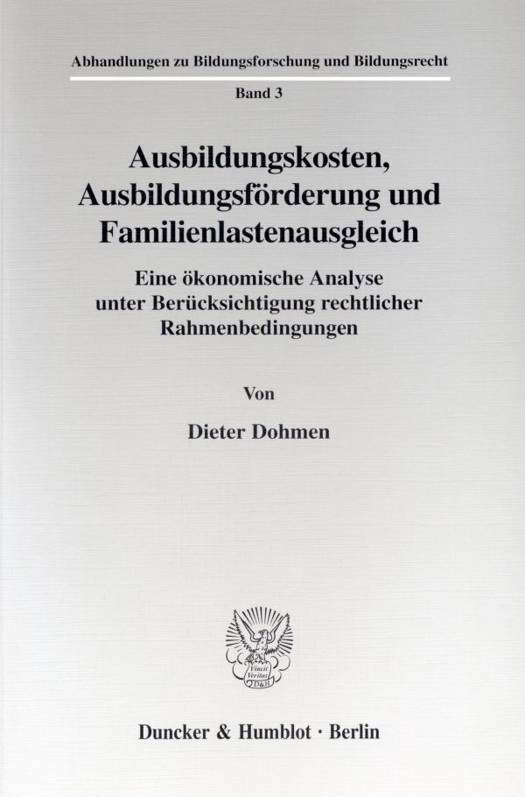 Theoretische Grundlage der Arbeit ist eine getrennte Analyse des Entscheidungsverhaltens der Auszubildenden über weitere Ausbildungen, unter Berücksichtigung der für deren Finanzierung zur Verfügung stehenden Instrumente (Ersparnisse, Darlehen, Elternunterhalt, Erwerbstätigkeit), und seiner Eltern über ihre finanzielle Beteiligung an der Ausbildung. Durch diese Differenzierung der Entscheidungsebenen kann gezeigt werden, daß es neben externen Effekten der Bildung und der Kindererziehung weitere, bisher nicht erkannte Rechtfertigungsgründe für ein staatliches Eingreifen in die Bildungsfinanzierung gibt.