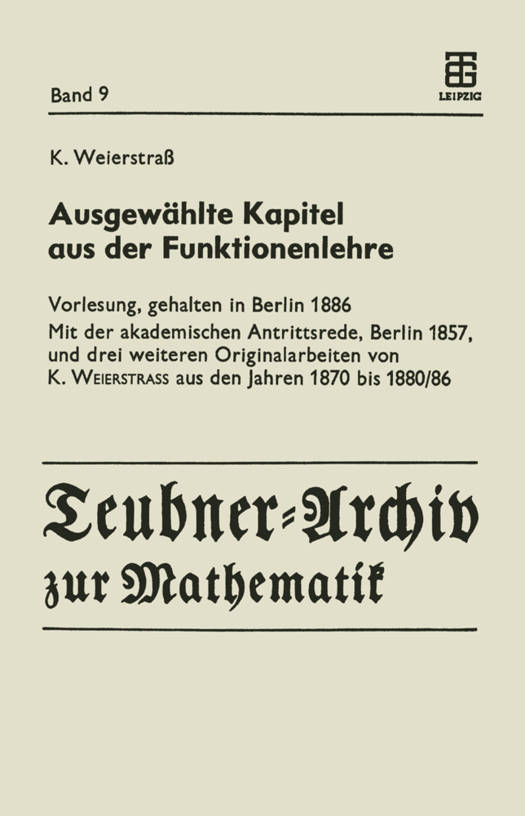 Vorlesung, Gehalten in Berlin 1886 Mit Der Akademischen Antrittsrede, Berlin 1857, Und Drei Weiteren Originalarbeiten Von K. Weierstrass Aus Den Jahren 1870 Bis 1880/86
