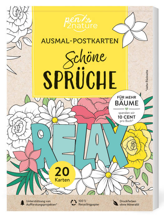 Alle Bücher und Blöcke wurden mit Farben auf Pflanzenöl-Basis und auf 100 % Recyclingpapier gedruckt. Der Verlag pen2nature unterstützt Klimaschutzprojekte und spendet 10 Cent pro Produkt für die Pflanzung neuer Bäume in heimischen Wäldern.