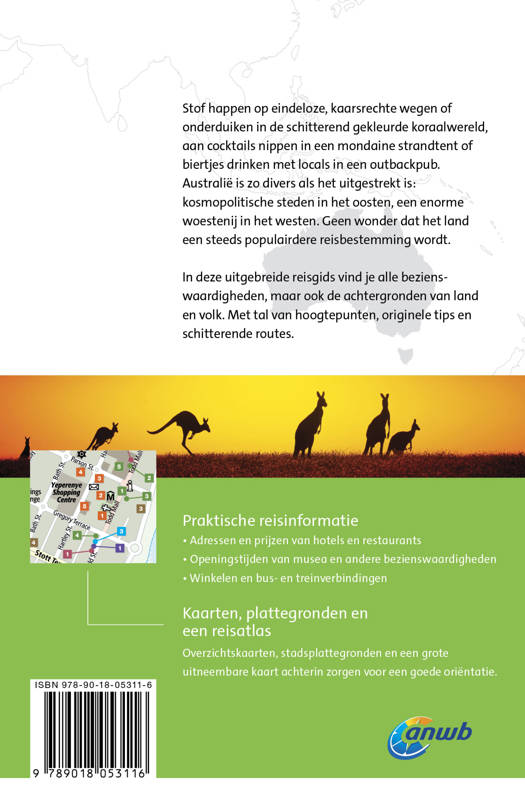 De uitgebreide Australië reisgids telt meer dan 500 pagina’s boordevol hoogtepunten, originele tips, schitterende wandelroutes en alles over de achtergronden van land en volk. Daarnaast alle praktische informatie zoals openingstijden van musea, tips voor overnachtingen en vervoerstijden. Inclusief stadsplattegronden, overzichtskaarten en achterin een kleine atlas. Kortom: een onmisbare ANWB gids voor een geweldige rondreis door Australië.