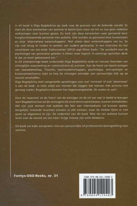 Olga Bogdashina stelt vastgestelde opvattingen over wat 'normaal' of wat 'abnormaal' is aan de kaak. Je hebt altijd wel mensen die zeggen dat mensen met autisme niet genoeg voelen. Bogdashina beweert het tegenovergestelde: Ze voelen te veel. Door de 'waaroms' en de 'hoe's' van de zintuigen en de rol van taal in beeld te brengen leert Bogdashina hoe we de vermogens die onze kennis aanscherpen, kunnen ontwikkelen. Het zijn juist mensen met autisme die hier een intermediaire rol kunnen spelen. Dergelijke 'vreemde' krachten schuilen in alle mensen, maar de meeste lijken er niet goed op afgestemd te zijn. De ondertitel van dit boek 'Wat we van autisme kunnen leren over de wereld om ons heen' krijgt hiemee zijn volle betekenis.