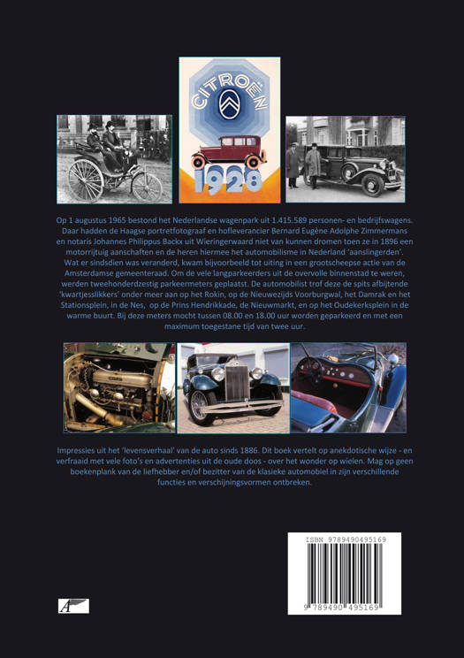 "Op 1 augustus 1965 bestond het Nederlandse wagenpark uit 1.415.589 personen- en bedrijfswagens. Daar hadden de Haagse portretfotograaf en hofleverancier Bernard Eugène Adolphe Zimmermans en notaris Johannes Philippus Backx uit Wieringerwaard niet van kunnen dromen toen ze in 1896 een motorrijtuig aanschaften en de heren hiermee het automobilisme in Nederland ‘aanslingerden’. Wat er sindsdien was veranderd, kwam bijvoorbeeld tot uiting in een grootscheepse actie van de Amsterdamse gemeenteraad. Om de vele langparkeerders uit de overvolle binnenstad te weren, werden tweehonderdzestig parkeermeters geplaatst. De automobilist trof deze de spits afbijtende ‘kwartjesslikkers’ onder meer aan op het Rokin, op de Nieuwezijds Voorburgwal, het Damrak en het Stationsplein, in de Nes, op de Prins Hendrikkade, de Nieuwmarkt, en op het Oudekerksplein in de warme buurt. Bij deze meters mocht tussen 08.00 en 18.00 uur worden geparkeerd en met een maximum toegestane tijd van twee uur. Impressies uit het ‘levensverhaal’ van de auto sinds 1886. Dit boek vertelt op anekdotische wijze - en verfraaid met vele foto’s en advertenties uit de oude doos - over het wonder op wielen. Mag op geen boekenplank van de liefhebber en/of bezitter van de klasieke automobiel in zijn verschillende functies en verschijningsvormen ontbreken."