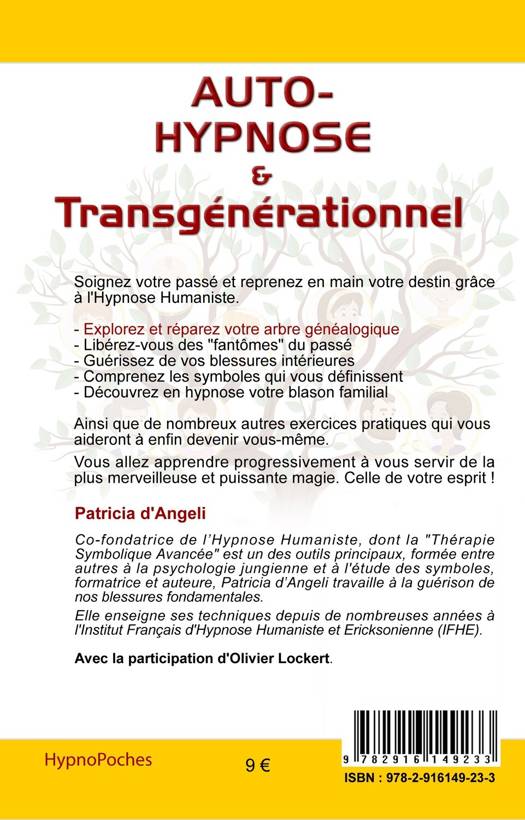 Soignez votre passé et reprenez en main votre destin grâce à l’Hypnose Humaniste. - Explorez et réparez votre arbre généalogique - Libérez-vous des «?fantômes » du passé - Guérissez de vos blessures intérieures - Comprenez les symboles qui vous définissent - Découvrez en hypnose votre blason familial. Ainsi que de nombreux autres exercices pratiques qui vous aideront à enfin devenir vous-même. Vous allez apprendre progressivement à vous servir de la plus merveilleuse et puissante magie. Celle de votre esprit ! Ce nouvel ouvrage de la collection « HypnoPoches » a une double fonction. D’abord, aider le lecteur à aller mieux dans sa vie en soignant des blessures émotionnelles dont les racines sont enfouies dans les méandres transgénérationnels (psychogénéalogie), grâce à des techniques inédites d’Hypnose Humaniste (exercices simples à réaliser en auto-hypnose). La méthode a été testée et approuvée par des dizaines de patients depuis plusieurs années. Ensuite, l’auteure souhaite montrer aux thérapeutes en formation à l’Hypnose comment se servir des techniques apprises en cours. Ouvrage écrit en collaboration avec Olivier Lockert pour les parties techniques en hypnose.