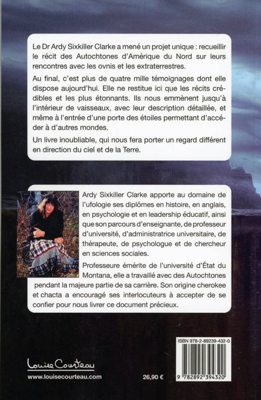 Le docteur Ardy Sixkiller Clarke a mené un projet unique : recueillir le récit des autochtones d'Amérique du Nord sur leurs rencontres avec les ovnis et les extraterrestres. Au final, c'est plus de quatre mille témoignages dont elle dispose aujourd'hui. Elle ne restitue ici que les récits crédibles et les plus étonnants. Ils nous emmènent jusqu'à l'intérieur de vaisseaux, avec leur description détaillée, et même à l'entrée d'une porte des étoiles permettant d'accéder à d'autres mondes. Un livre inoubliable, qui nous fera porter un regard différent en direction du ciel et de la Terre.