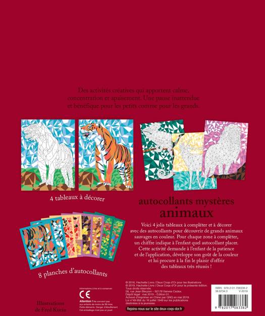 4 tableaux mystères à compléter et à décorer grâce à 8 planches d'autocollants. Grâce au code présent sur les tableaux, l'enfant applique le bon autocollant sur les zones à compléter et le tour est joué : les tableaux laissent apparaître de grands animaux sauvages !