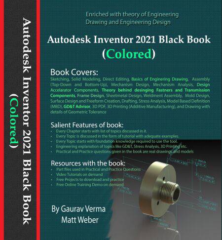 The Autodesk Inventor 2021 Black Book is the second edition of our series on Autodesk Inventor. With lots of features and thorough review, we present a book to help professionals as well as beginners in creating some of the most complex solid models. The book follows a step by step methodology. In this book, we have tried to give real-world examples with real challenges in designing. We have tried to reduce the gap between university use of Autodesk Inventor and industrial use of Autodesk Inventor. In this edition of book, we have included topics on Sketching, 3D Part Designing, Assembly Design, Sheetmetal, Weldments, Mold Design, Surface Design, Structural Analysis, 3D printing, MBD (Model Based Definition), 3D PDFs, and many other topics. The book covers almost all the information required by a learner to master the Autodesk Inventor. The book starts with sketching and ends at advanced topics like Mold Design, Sheetmetal, Weldment, and MBD. Some of the salient features of this book are :