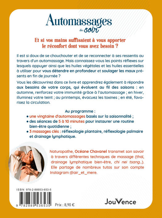 Vous les découvrirez dans ce livre et apprendrez également à répondre aux besoins de votre corps, qui évoluent au fil des saisons : en automne, renforcez votre immunité grâce à l’automassage ; en hiver, illuminez votre teint ; au printemps, évacuez les toxines ; en été, favorisez la circulation.