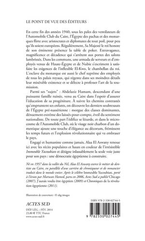 Parmi ses "sujets" : Abdelaziz Hamam, descendant d'une puissante famille ruinée, venu au Caire dans l'espoir d'assurer l'éducation de sa progéniture. À suivre les chemins contrastés qu'empruntent ses enfants, on découvre les derniers soubresauts de l'Égypte pré- nassérienne : morgue des classes dominantes, dénuement extrême des laissés-pour-compte, éveil du sentiment nationaliste. De toute part l'édifice se lézarde, et dans le microcosme de l'Automobile Club, où le visage noir charbon d'un domestique ajoute une touche d'élégance au décorum, frémissent les temps futurs et l'explosion révolutionnaire qui va embraser le pays.