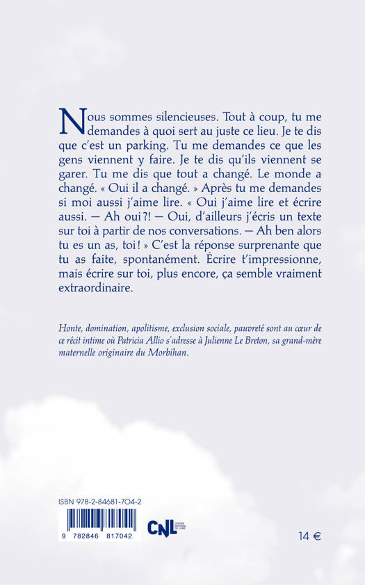 Pendant plusieurs années, Patricia Allio a écrit un texte où elle s’adresse à Julienne Le Breton, sa grand-mère maternelle originaire du Morbihan. Au détour de restitutions de conversations qu’elle a enregistrées dans la voiture ou le long du Canal de Nantes à Brest, de souvenirs, d’anecdotes, elle soulève la question de l’héritage paradoxal, notamment sous forme de honte de soi, de déni et de culpabilité. L’auteure interroge notamment le poids de la honte liée à la langue maternelle interdite, le breton.