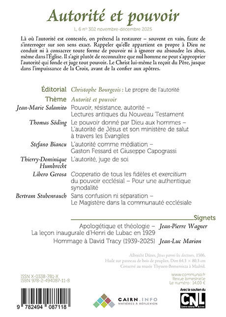 On déplore à raison le déclin de l'autorité , on prétend la restaurer - souvent en vain, faute de s'interroger sur son sens exact, dans la société comme dans la vie de l'Église. Rappeler que l'autorité appartient en propre à Dieu et que « tout pouvoir vient de Dieu », est-ce promouvoir une conception autoritaire du pouvoir, nier les risques d'abus, dans l'Église même ? En abordant aussi bien le rôle des chrétiens dans la cité, le sens politique de l'autorité que la fonction du magistère dans une Église synodale ou le problème des abus de pouvoir, ce numéro envisage l'autorité à la fois comme instance critique de tout pouvoir et comme ce qui autorise et garantit la liberté. Avec des contributions de Jean-Marie Salamito, Thomas Söding , Stefano Biancu , Thierry-Dominique Humbrecht , Libero Gerosa, Bertram Stubenrauch