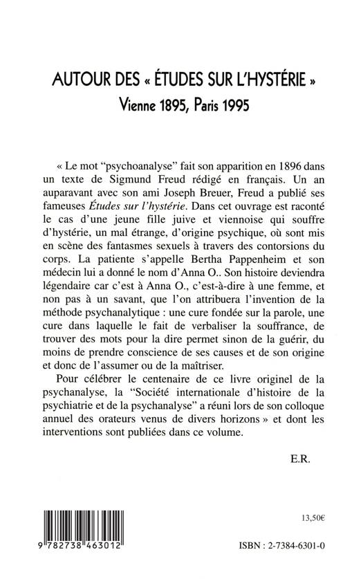 Le mot "psychoanalyse " fait son apparition en 1896 dans un texte de Sigmund Freud. Un an auparavant, Freud a publié ses fameuses Études sur l'hystérie. Dans cet ouvrage est raconté le cas d'une jeune fille juive et viennoise qui souffre d'hystérie. Son histoire deviendra légendaire car c'est à Anna O., c'est-à-dire à une femme, que l'on attribuera l'invention de la méthode psychanalytique : une cure fondée sur la parole pour prendre conscience des causes de la souffrance. Un ensemble de contributions à l'occasion du centenaire de la psychanalyse.