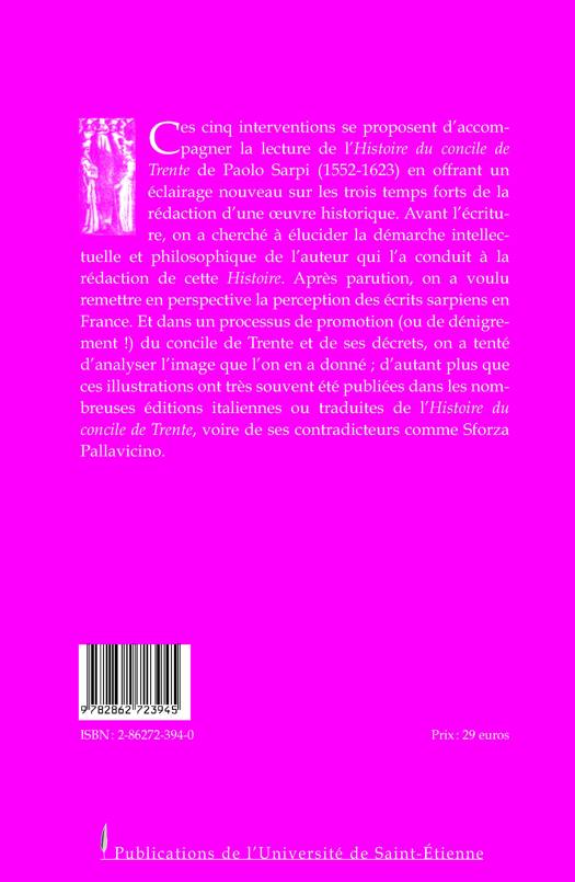 A l'occasion de la réédition intégrale de l'Histoire du concile de Trente de P. Sarpi en traduction française, des historiens font le point sur la lecture de ce texte et s'interrogent sur la démarche intellectuelle qui a présidé à la rédaction de ces écrits, sur la réception qui en a été faite et sur l'image qui en a été conservée.