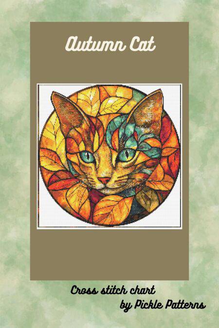 These cross stitch charts are a whimsical circular design of a ginger cat reminiscent of art nouveau stained glass. The cats face is surrounded by autumnal coloured leaves