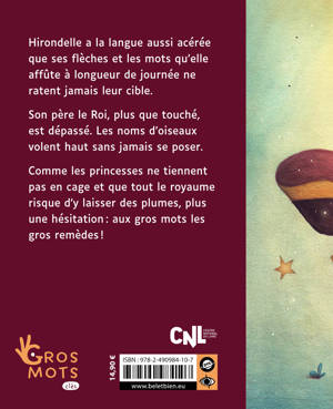 « Hirondelle a la langue aussi acérée que ses flèches et les mots qu’elle affute à longueur de journée ne ratent jamais leur cible. Son père le Roi, plus que touché, est dépassé. De fait, les noms d’oiseaux volent sans jamais se poser ! Comme les princesses ne tiennent pas en cage et que tout le royaume risque d’y laisser des plumes, plus une hésitation : aux gros mots les gros remèdes ! »