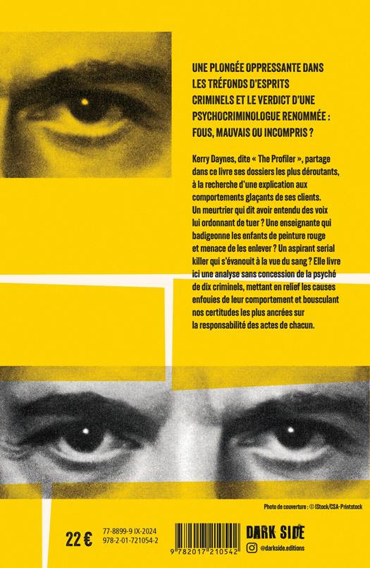 Kerry Daynes, dite "The Profiler", partage dans ce livre ses dossiers les plus déroutants, à la recherche d'une explication aux comportements glaçants de ses clients. Un meurtrier qui dit avoir entendu des voix lui ordonnant de tuer ? Une enseignante qui badigeonne les enfants de peinture rouge et menace de les enlever ? Un aspirant serial killer qui s'évanouit à la vue du sang ? Elle livre ici une analyse sans concession de la psyché de dix criminels, mettant en relief les causes enfouies de leur comportement et bousculant nos certitudes les plus ancrées sur la responsabilité des actes de chacun.