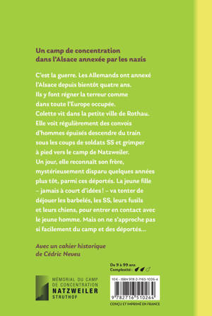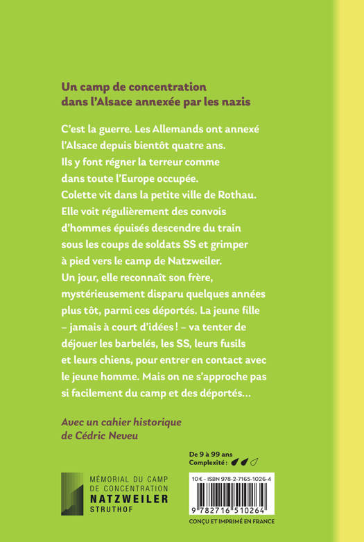 Un camp de concentration dans l’Alsace annexée par les nazis C’est la guerre. Les Allemands ont annexé l’Alsace depuis bientôt quatre ans. Ils y font régner la terreur comme dans toute l’Europe occupée. Colette vit dans la petite ville de Rothau. Elle voit régulièrement des convois d’hommes épuisés descendre du train sous les coups de soldats SS et grimper à pied vers le camp de Natzweiler. Un jour, elle reconnaît son frère, mystérieusement disparu quelques années plus tôt, parmi ces déportés. La jeune fille – jamais à court d’idées ! – va tenter de déjouer les barbelés, les SS, leurs fusils et leurs chiens, pour entrer en contact avec le jeune homme. Mais on ne s’approche pas si facilement du camp et des déportés... Avec un cahier historique de Cédric Neveu