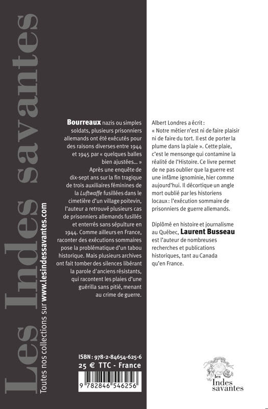 Après une enquête de dix-sept ans sur la fin tragique de trois auxiliaires féminines de la Luftwaffe fusillées dans le cimetière d’un village poitevin, l’auteur a retrouvé plusieurs cas de prisonniers allemands fusillés et enterrés sans sépulture en 1944. Comme ailleurs en France, raconter des exécutions sommaires pose la problématique d’un tabou historique. Mais plusieurs archives ont fait tomber des silences libérant la parole d'anciens résistants, qui racontent les plaies d’une guérilla sans pitié, menant au crime de guerre.