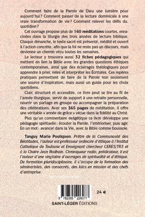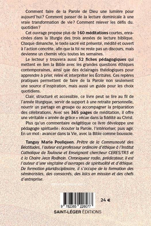 Cet ouvrage propose plus de 150 méditations courtes et accessibles, réparties sur les trois années liturgiques (A, B, C). Chaque dimanche, à partir des textes bibliques, le lecteur est invité à écouter, intérioriser et agir à la lumière de la Parole de Dieu. Des fiches thématiques et excursus éclairent le lien vital entre Bible et morale chrétienne, entre source et action. Tanguy Marie Pouliquen, prêtre de la Communauté des Béatitudes et professeur d’éthique à l’Institut Catholique de Toulouse, offre un itinéraire spirituel nourri d’expérience pastorale et académique. Véritable retraite en continu ou compagnon de préparation dominicale, ce livre veut soutenir la foi, stimuler l’action et redonner espérance. Une invitation à croiser le livre de la Vie et le livre de sa propre vie pour avancer toujours davantage dans la joie et la fécondité chrétiennes.