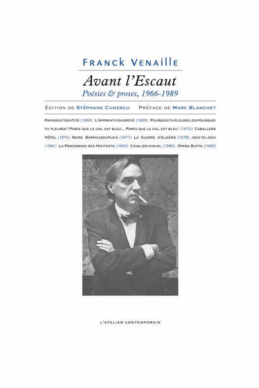 Avant l’Escaut – Poésies et proses, 1966-1983 est un abondant volume, recueillant une petite dizaine de livres, tous épuisés, de l’écrivain Franck Venaille – dont le talent, selon son ami Lucien Becker, consistait à dire avec une langue des plus quotidiennes « tout le tragique existant n’importe où et dans n’importe quoi ». Écrivain aux multiples facettes, poète, homme de radio, ami des peintres de la Figuration narrative Jacques Monory ou Peter Klasen, ses textes sont constamment hantés par une mélancolie venue de l’enfance, et par les horreurs de la guerre d’Algérie, tourments avec lesquels il se débat dans les rues de Paris, de Bruxelles, ou d’Ostende. Sa poésie est profondément moderne, mêlant vers heurtés, expérimentations typographiques, fragments de prose, collages de textes empruntés à Pierre Jean Jouve ou à Soeren Kierkegaard, dialogues photographiques et picturaux. On retrouve en outre, au sein de ce volume, quelques images : pages de manuscrits, pages arrachées à des livres de poche dont il se servait pour préparer ses collages, peintures de Jacques Monory qui accompagnaient certaines éditions originales, aperçus des étonnantes revues qu’il a créées, comme Chorus ou Monsieur Bloom.