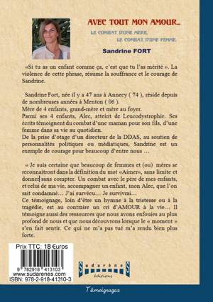 "Si tu as un enfant comme ça, c'est que tu l'as mérité". La violence de cette phrase, résume la souffrance et le courage de Sandrine. "À travers ces lignes je ne règle pas mes comptes... J'écris juste ce que j'ai encaissé durant ces 20 dernières années avec une belle famille connue à Monaco. je décrits aussi leurs faces cachées... Je suis certaine que beaucoup de femmes et (ou) mères se reconnaitront dans la définition du mot "Aimer", sans limite et donner sans compter. Un combat avec le père de mes enfants, et celui de ma vie, accompagner un enfant, mon Alec, que l'on sait condamné... J'ai survécu... Je survivrai... Ce témoignage, loin d'être un hymne à la tristesse ou à la tragédie, est au contraire un cri d'AMOUR à la vie... Il témoigne aussi des ressources que nous avons enfouies au plus profond de nous et que nous découvrons lorsque le "moment" s'en fait sentir. Ce qui ne m'a pas tué m'a rendu bien plus forte ! À PROPOS DE L'AUTEURE Sandrine Fort réside à Menton. Mère de 4 enfants, grand-mère et mère au foyer. Parmi ses enfants, Alec, atteint de Leucodystrophie. Ses écrits témoignent du combat d'une maman pour son fils, d'une femme dans sa vie au quotidien. De la prise d'otage d'un directeur de la DDAS, au soutien de personnalités politiques ou médiatiques, Sandrine est un exemple de courage pour beaucoup d'entre nous...