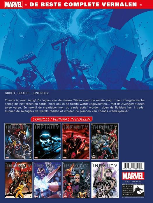 Om de wereld te redden van grotere gevaren, moeten de Avengers ook groter worden... Marvels grootste event nadert! Thanos maakt zijn wereldschokkende terugkeer en zijn legers vuren de openingsschoten af van een galactische oorlog die zowel op aarde als in de verre ruimte zal worden uitgevochten. Met onze helden gevangen tussen beide veldslagen! Terwijl Thanos' geheimen worden onthuld, valt de stad Attilan van de Inhumans en bevinden de Illuminati zich aan de frontlinie! En terwijl elke Origin-site op aarde actief wordt, betreden de Builders het Marvel-universum. Maar kunnen de Avengers op tijd terugkeren naar de aarde om haar te redden, wanneer verraad in de Galactic Council hen krijgsgevangenen heeft gemaakt? Galactische rijken zullen vallen als de gestoorde plannen van Thanos werkelijkheid worden!