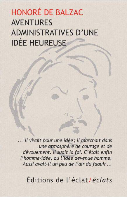 Bien qu’inachevées, les Aventures administratives d’une idée heureuse, petit chef d’œuvre d’une ironie mordante, doublée de la critique acerbe de la bureaucratie et des enjeux de pouvoir, contient tous les ingrédients de la narration balzacienne. Le texte aurait dû faire partie des études philosophiques qui accompagnaient les grands cycles de la Comédie humaine, mais les mille taches qui occupaient Balzac eurent raison de ces Aventures, même si tout est déjà là: un sujet, des personnages haut en couleur, un humour ravageur, une courtisane, un jeune homme, du fantastique (ou comment enfermer dans une fiole les idées d’un individu) et enfin un ‘idée’ : comment l’idée survit à l’homme et est transmise de génération en génération jusqu’à se confondre avec l’homme lui-même.